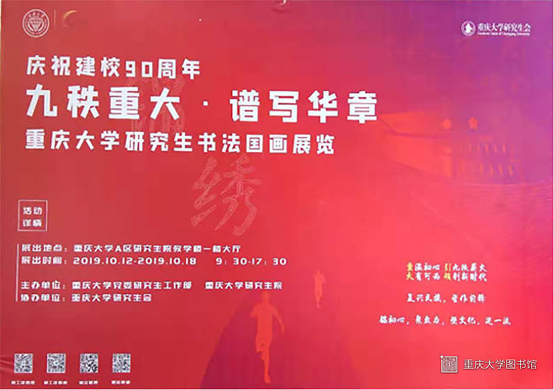 以“九秩重大,谱写华章”为主题的重庆大学研究生书法国画展在重庆大学A区研究生院一楼拉开帷幕。本次研究生书法国画展由重庆大学党委研究生工作部、重庆大学研究生院主办,重庆大学研究生会承办。展出作品以笔墨歌颂祖国,以色彩礼赞中华。以庆祝“新中国成立七十周年,重庆大学九十华诞”为契机,旨在弘扬中华文化精粹,展现研究生青春风采,增添校园文化氛围。本次展览中的作品不仅体现了青年学生对祖国的深情热爱以及诚挚祝福,表达了重庆大学学子对母校的美好愿想以及期盼,也充分展现了优秀书法爱好者的才情智慧和艺术品格。