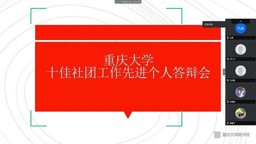 重庆大学学生社团中心秉持“一流社团引领一流文化、一流社团培育一流学生、一流社团助力一流学科”的工作理念,在校党委领导、校团委指导下,致力于开展社团建设工作。为弘扬五四精神,培育优秀典型,2020年4月20日下午,学生社团中心组织开展了重庆大学“十佳学生社团工作先进个人”线上评选答辩会。