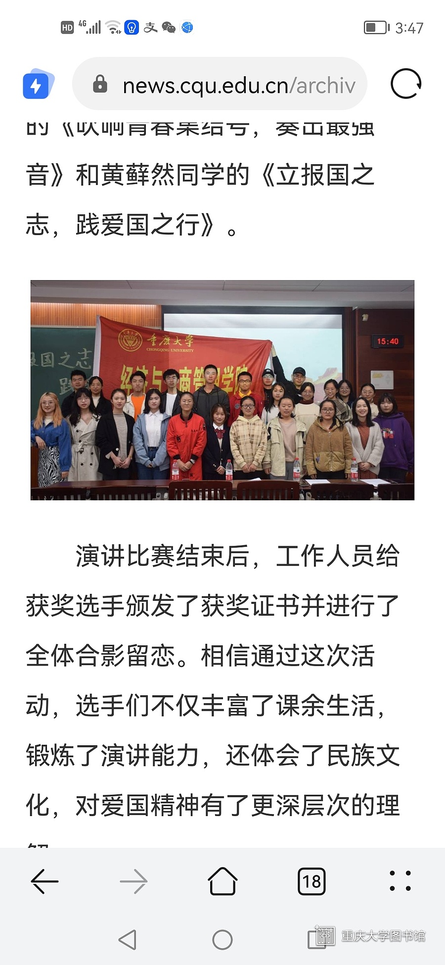 2020年10月29日下午,由重庆大学经济与工商管理学院与重庆大学“弘毅”工作室举办的“立报国之志,践爱国之行”主题演讲比赛在重庆大学虎溪校区第一教学楼举行。