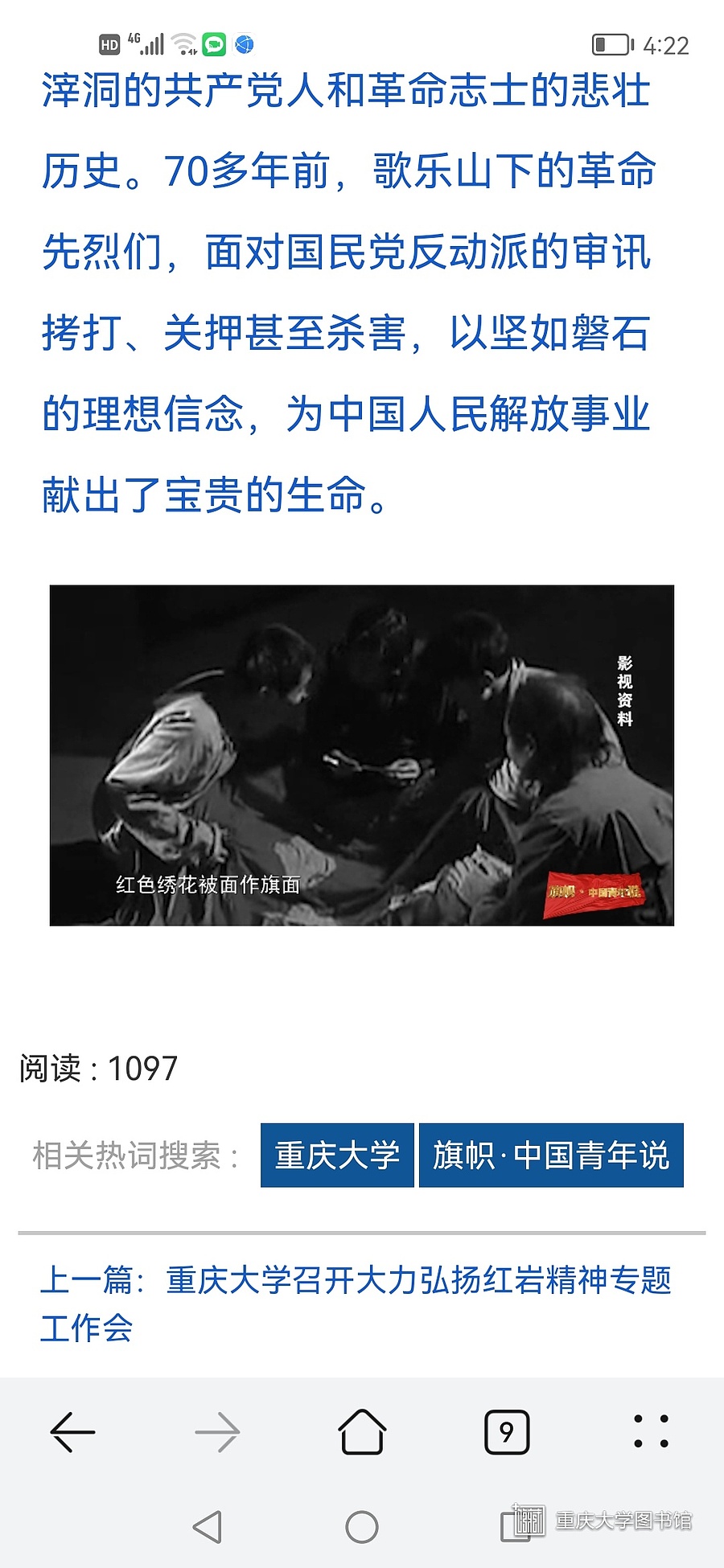 由重庆大学、教育部高校思想政治工作创新发展中心(重庆大学)联合重庆红岩革命历史博物馆负责策划拍摄制作的百集大型节目《旗帜·中国青年说》两集节目《重庆谈判》和《歌乐山下》已分别于6月29日和7月2日在全国各教育电视台、学习强国、人民网、新华网、央视频同步上线。