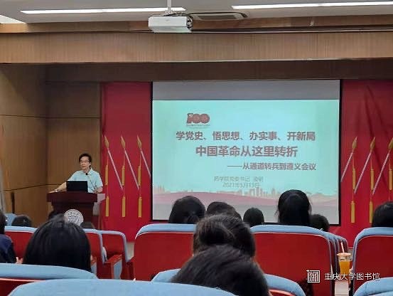 2021年5月13日下午,重庆大学药学院党委在药学院一楼学术报告厅组织开展“《学党史、悟思想、办实事、开新局》药学院党委书记讲党课——中国革命从这里转折——从通道转兵到遵义会议”学党史教育活动,此次活动邀请学院党委书记凌明同志主讲,博士支部、硕士支部、本科支部全体党员及入党积极分子和硕博一支部全体入党积极分子到场参加学习,聆听凌明书记讲述中国共产党史。