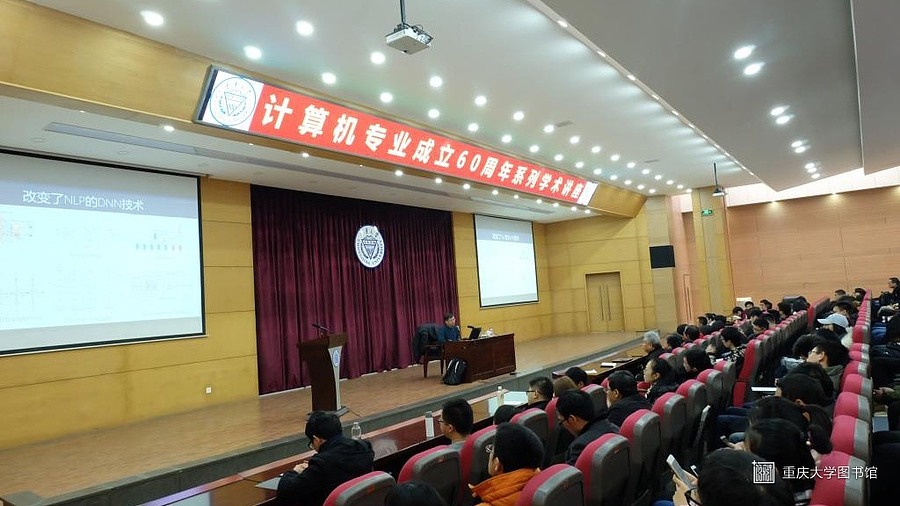 2018年12月14日15:00,重庆大学计算机专业成立60周年系列学术讲座——“自然语言处理的进展”于A区民主湖报告厅举办,重庆大学计算机学院邀请重大校友、微软亚洲研究院副院长周明教授主讲,由计算机学院郭松涛副院长主持。