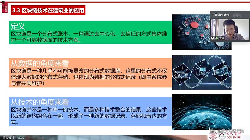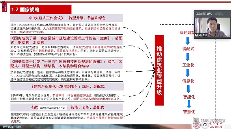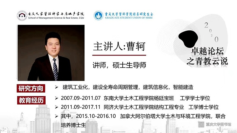 2020年5月15日下午2点半,由重庆大学党委研究生工作部、重庆大学研究生院主办,重庆大学管理科学与房地产学院团委研究生会、重庆大学研究生会承办的卓越论坛之青教云说第二期讲座顺利举办。本次讲座采用线上形式,主讲嘉宾为管理科学与房地产学院讲师、硕士生导师曹轲,讲座的主题为“建筑工业化与信息化的几点认识与思考”。