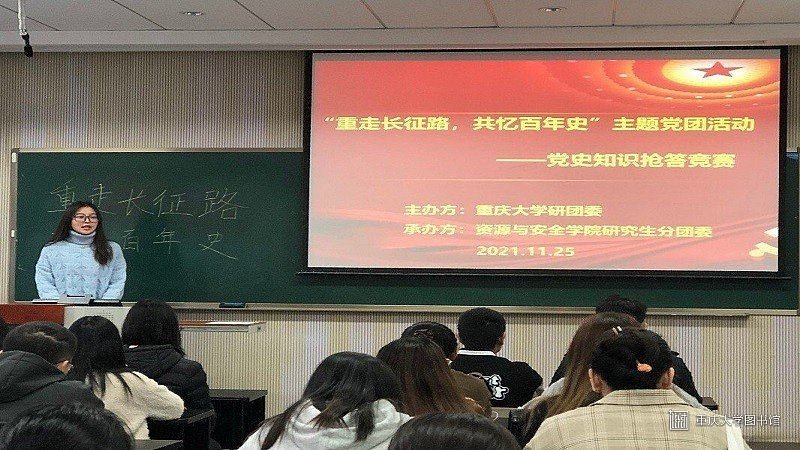 为深刻学习领会习近平总书记 "七一 "重要讲话精神,深入推进党史学习教育,不断激励和引导广大青年学子树立了远大理想,勇担时代大任,2021年11月15日至25日,资源与安全学院开展了以“重走长征路,共忆百年史”为主题的研究生党团活动。