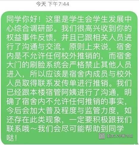 据同学反映,虎溪校区图书馆内校园网信号不稳定,时好时坏,给在图书馆查阅资料的同学增添了许多不便。该同学希望在权益君的帮助下,图书馆的网络环境可以得到改善。