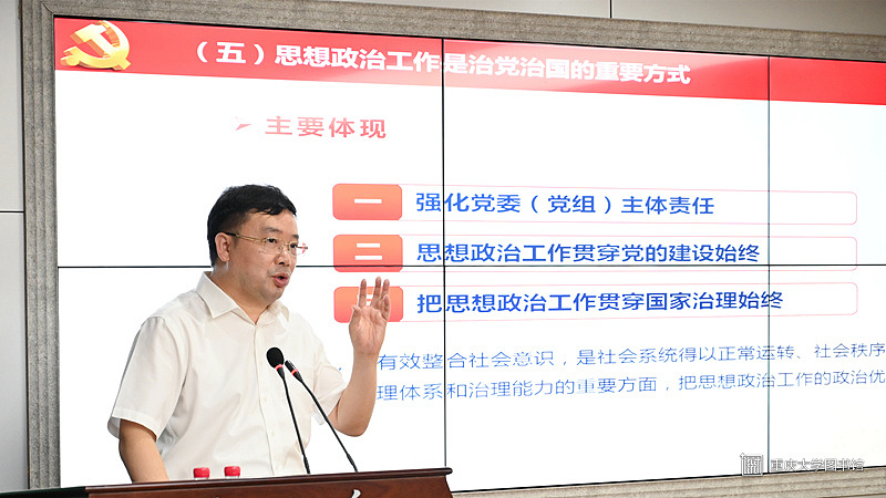 2022年6月13日晚,重庆大学马克思主义学院于408会议室举办“红岩讲坛”第三十讲,讲座邀请重庆市政法委副书记、市法学会党组织副书记马奇柯作题为“思想政治工作:治党治国的基本方式”的专题讲座。马克思主义学院党委书记罗滌、院长张邦辉、党委副书记温健琳及学院师生积极参与,讲座由张邦辉主持。